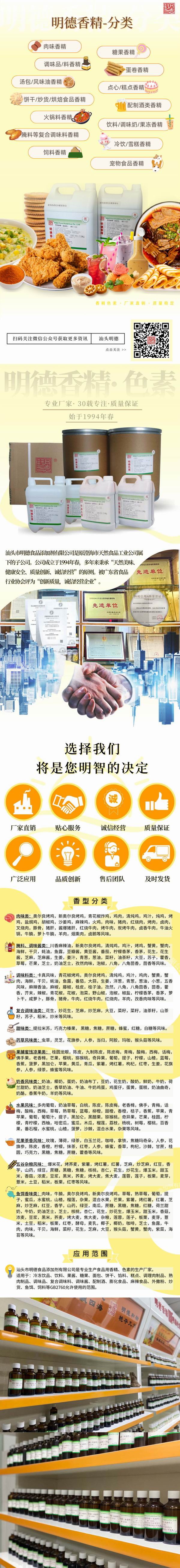 適用范圍:醬料/烤肉醬、肉制品、腌制料、調(diào)味品、膨化食品、外撒食品等GB2760允許添加食品用香精的食品。