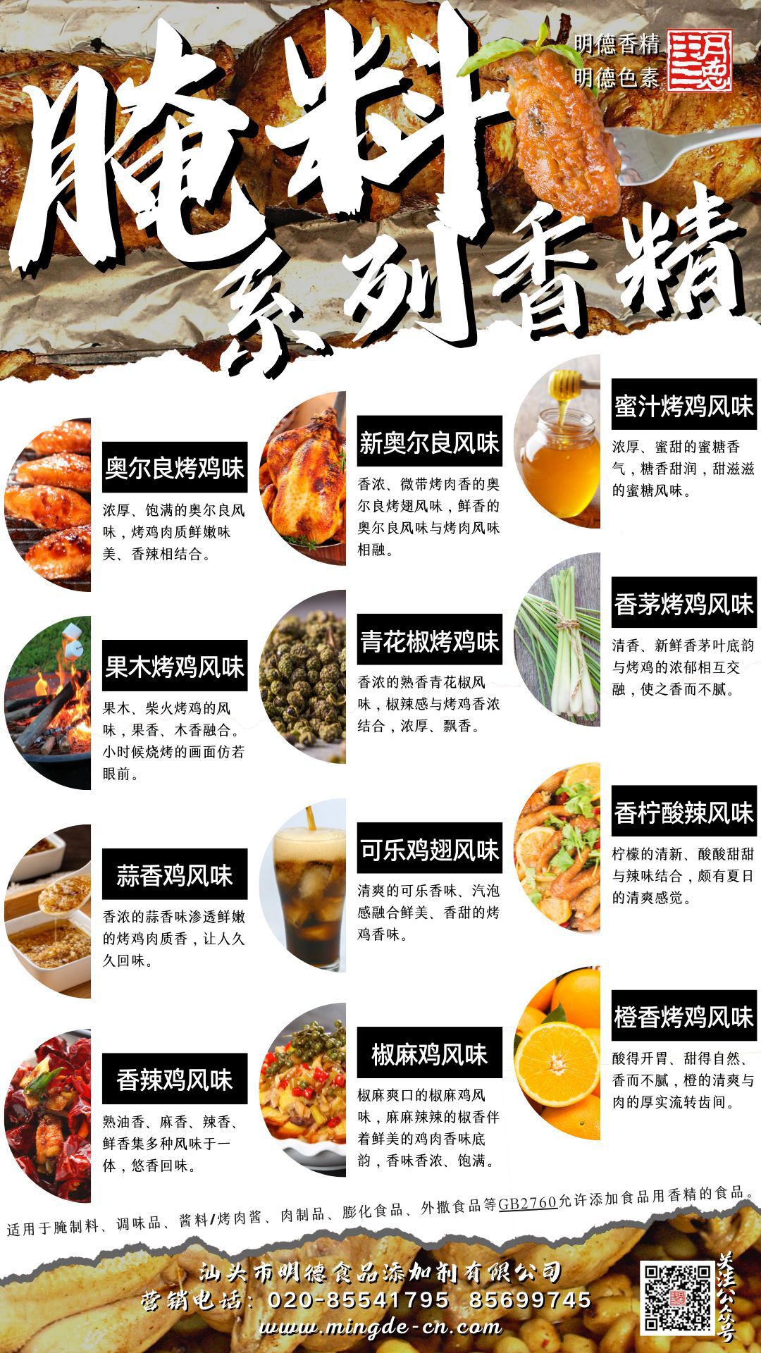在雞肉香精領(lǐng)域我們潛心專研,結(jié)合市場(chǎng)潮流,消費(fèi)者喜好,汕頭市明德食品添加劑有限公司現(xiàn)有以下16種雞肉相關(guān)風(fēng)味的香精,供您選擇。并持續(xù)努力研發(fā)更多符合市場(chǎng)需求的風(fēng)味。