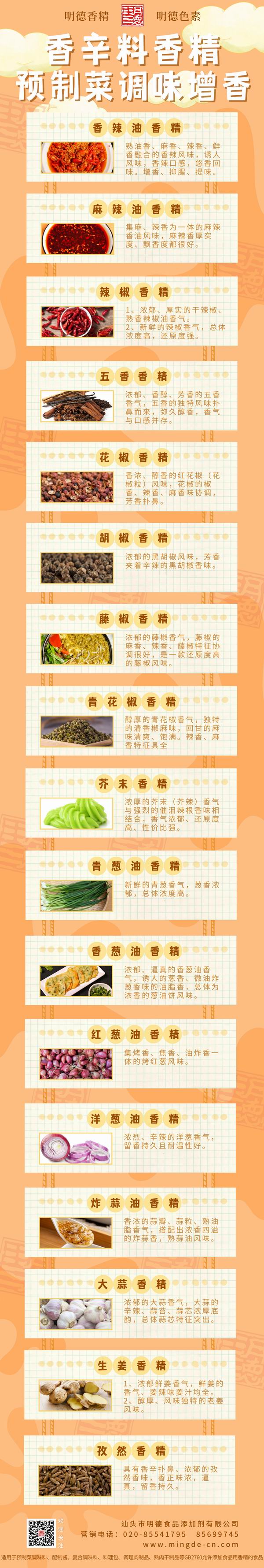 此外 明德食品添加劑 還研發(fā)了眾多香辛料風(fēng)味類香精,如小蔥、青蔥、炸蔥,如藤椒、花椒、麻椒等等,近10年來在復(fù)合調(diào)味料、腌料、醬料、火鍋底料多有應(yīng)用,頗受好評(píng)。諸如此類,各有特色。歡迎有興趣的廠家朋友們咨詢聯(lián)系!-